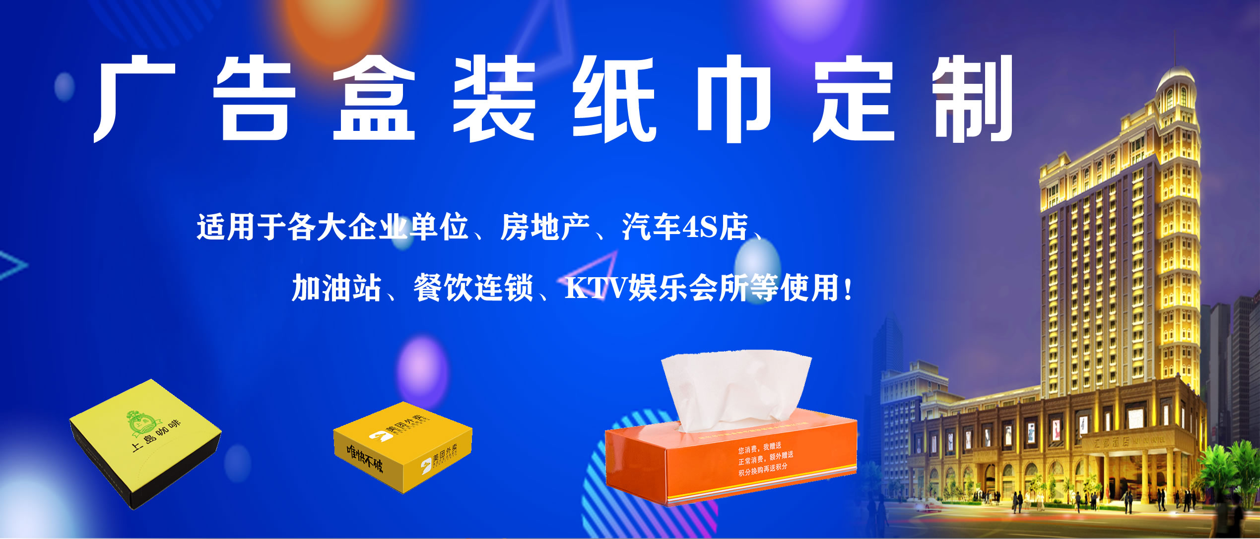 合肥億竹紙品包裝有限公司是一家專業(yè)從事各種生活用品定制的企業(yè),定制熱線:18919603840(周經(jīng)理)。公司與各大餐飲行業(yè)、酒店、加油站、學校、KTV娛樂會所、銀行、汽車4S店、房地產(chǎn)、廣告公司等客戶長期合作,業(yè)務覆蓋安徽全省。公司主營產(chǎn)品:廣告盒抽定制、餐巾紙定制、大盤紙、擦手紙、散抽紙等。有著完善的生產(chǎn)硬件設備和專業(yè)技術,及長期從事的豐富經(jīng)驗。 我廠專注生活用品多年,致力于生產(chǎn)“精致,高端,綠色,健康”于一體的優(yōu)質(zhì)產(chǎn)品,以誠信、實力和產(chǎn)品質(zhì)量獲得業(yè)界的認可。目前我廠產(chǎn)品已深得寶馬汽車、重慶劉一手火鍋餐飲連鎖、萬達集團、綠地集團等眾多客戶的青睞,業(yè)務量不斷攀升。